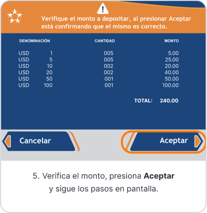 - Acepta hasta 35 billetes en buen estado por transacción.