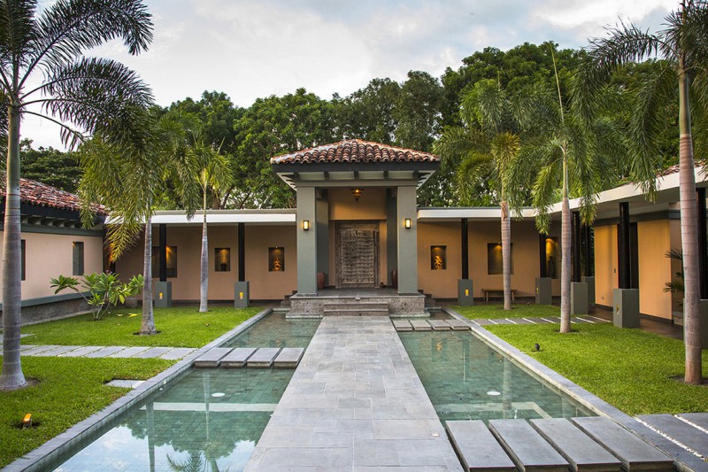 Dos portones traídos desde la India, que cuentan con una antigüedad de más de doscientos años, nos invitan a pasar y nos bridan un preámbulo de lo que esconde esta enigmática mansión. Pasamos entonces al interior, encontrando un amplio patio interno de gran limpieza y simetría donde se destaca un largo corredor que da la sensación de estar suspendido sobre el espejo de agua en el que descansa. Tres brazos que salen del pasillo central intercalados armónicamente y colocados en forma de pasos sueltos, permitiendo así que el agua fluya entre ellos, nos guían a las habitaciones que están ubicadas en villas independientes. Enmarca este espejo de agua un nítido jardín que, junto con gráciles palmeras, visten este patio.